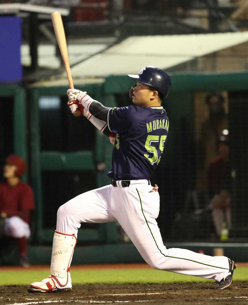 0-3の4回無死1塁、楽天先発・熊原の2球目を右中間スタンドへ。1055日ぶり勝利を目指す38歳「松坂世代」の先発・館山を援護する大きな2点を挙げ、1点差に迫った。