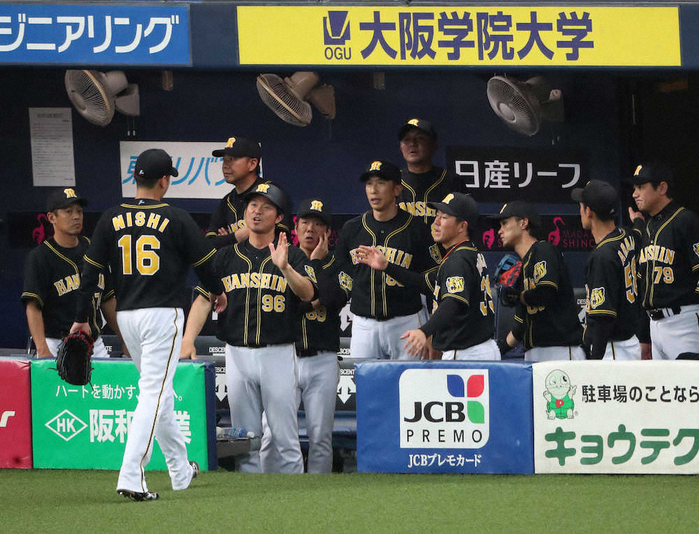 <オ・神>8回1死、降板となった西勇輝(16番)を出迎える矢野監督(中央奥)ら(撮影・坂田 高浩)
