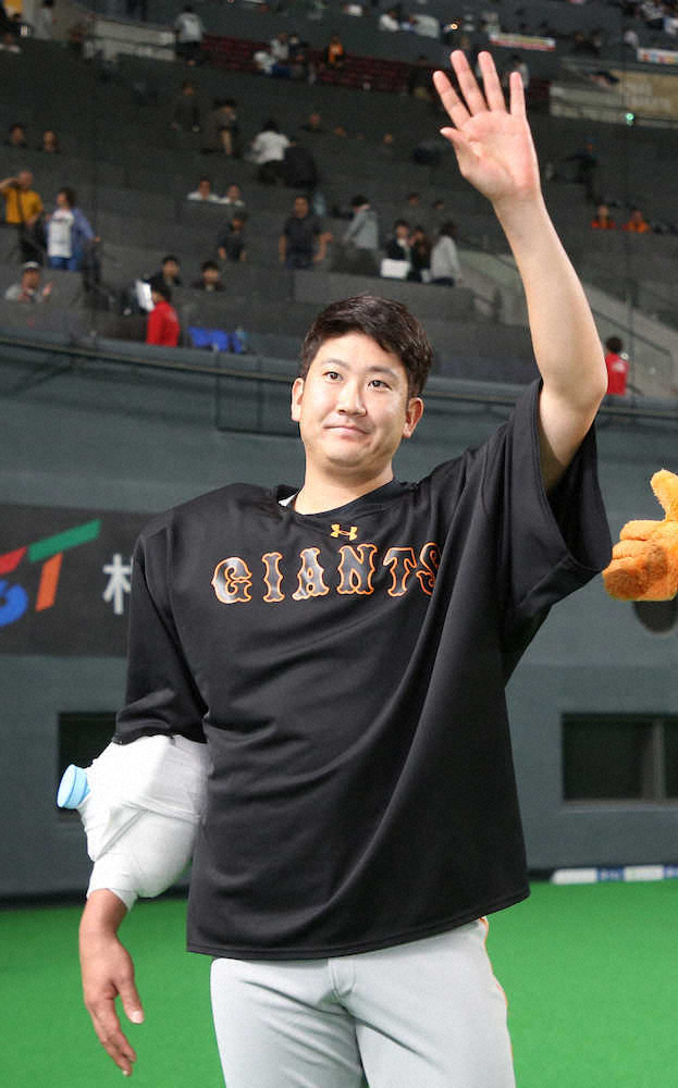 <日・巨3>ファンの声援に応える菅野(撮影・森沢裕)