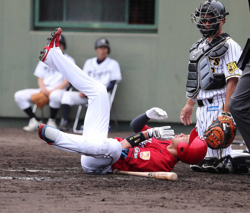 <ウエスタン神・広>8回2死1,2塁、斉藤の投球が頭部に死球を受けしゃがみ込む中村奨(撮影・後藤 正志) Photo by スポニチ 広島・中村奨 実戦復帰試合で頭部に死球受け負傷交代 救急車で病院へ搬送 ギャラリーで見る この記事のフォト 2019年06月18日の画像一覧 もっと見る 2019年06月18日の画像をもっと見る