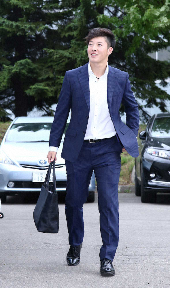 空港行きのチームバスに向かう吉田輝(撮影・高橋茂夫)