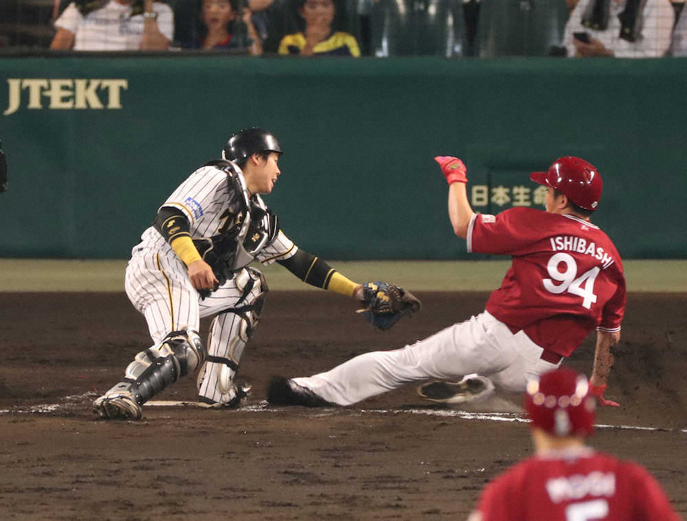 楽天・石橋が「神スライディング」で決勝点を奪った。2―2の7回2死一、二塁。島内の中前打に二塁走者として好スタートを切った。「試合でスライディングしたのは大学以来。10年ぶりです」。捕手・梅野のタッチを間一髪でかわすと左足から滑り込んだ。
