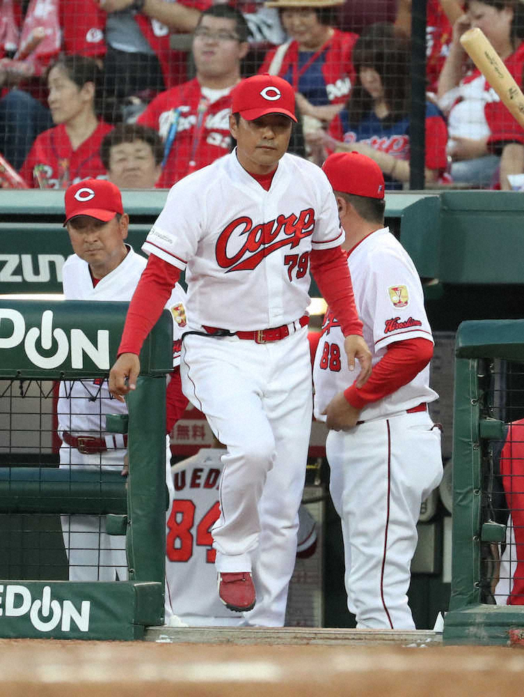 緒方監督の後には現役時代にエースだった佐々岡真司投手コーチ(51)からもアドバイスを受けた山口。5回のマウンドへは向かわず、守備につく前の主砲・鈴木誠也外野手(24)に励ましのグータッチをもらってベンチ裏に消えた。