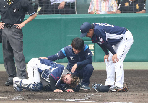 前日の同戦でも捕手・森の股間付近にファウルが直撃するアクシデントが起こったが、そのまま捕手を務めていた。