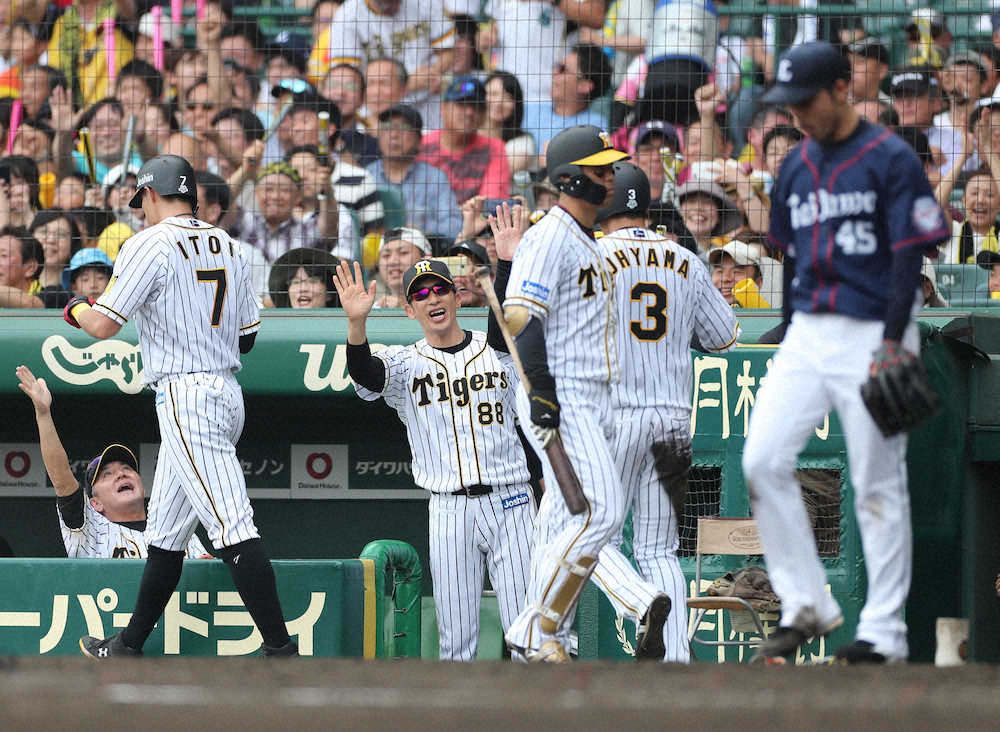 <神・西>4回1死2,3塁、逆転の生還する糸井(左)、大山(右二人目を)笑顔で迎える矢野監督(中央)(撮影・後藤 正志)