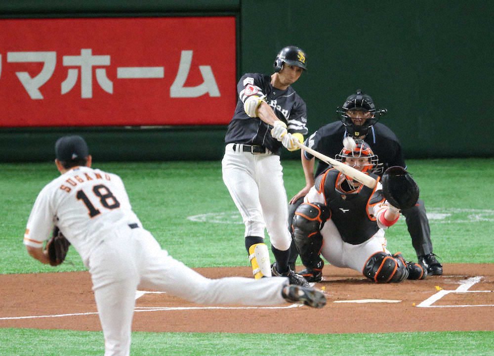 ソフトバンク・福田が優勝へ導く痛烈な先制パンチを見舞った。初回、菅野の147キロ直球を右中間へ。13年目で初の先頭打者弾からチームも4点を奪い、沢村賞右腕を早々とKOした。