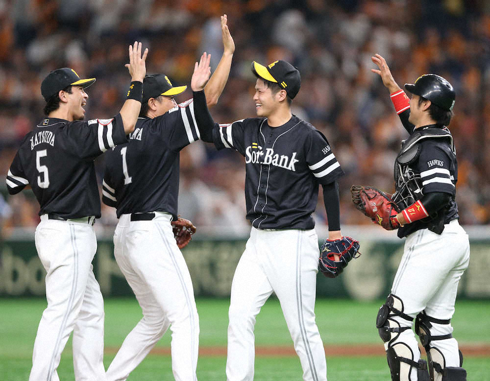 ドラフト1位のソフトバンク・甲斐野が感極まった。4点リードの9回に登板。最高156キロの直球で3者凡退に斬り、ナインと歓喜を分かち合った。