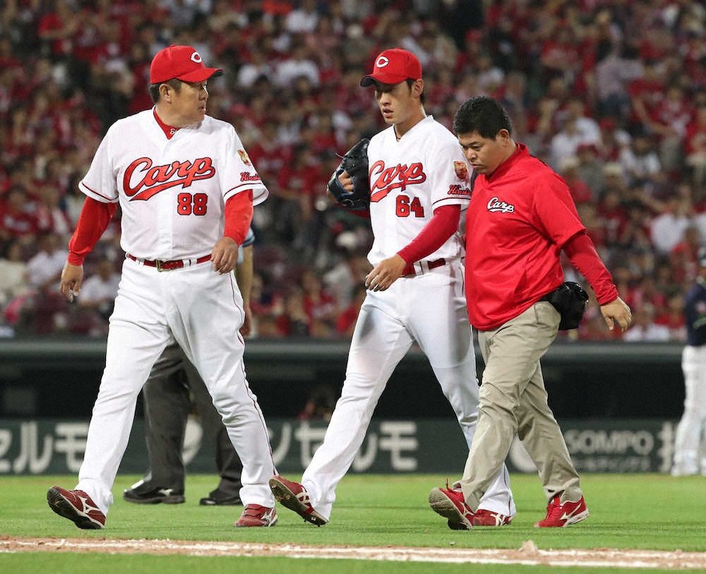 だが、この時にアクシデントがあった模様で、佐々岡投手コーチとトレーナーに付き添われ、自ら歩いてベンチ裏へ消えた。