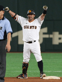 7回1死一、二塁、代打・阿部は同点適時二塁打を放ち、ベース上でガッツポーズ(撮影・森沢裕)