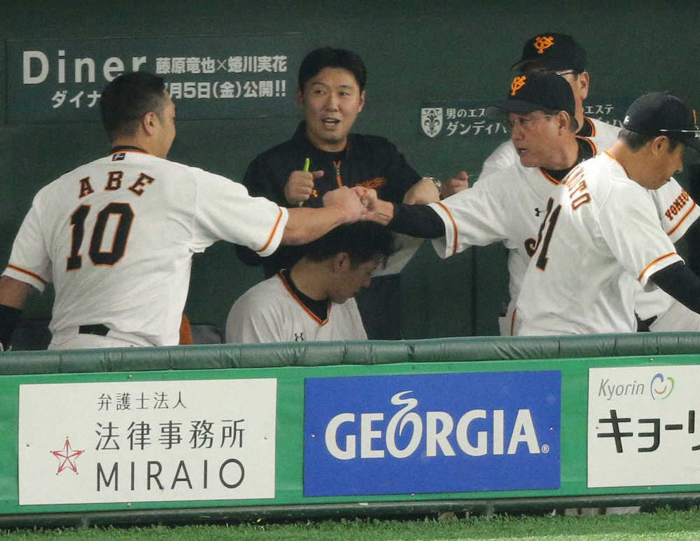 7回1死一、二塁、代打同点適時二塁打を放った阿部(左)とグータッチを交わす原監督(撮影・木村 揚輔)