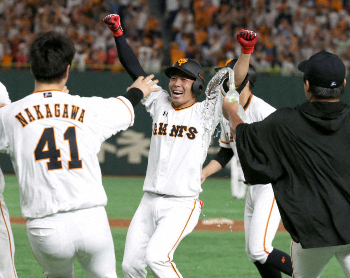 <巨・中>バントを決めた増田はナインの手荒い祝福を受ける(5)(撮影・森沢裕)
