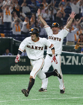 <巨・中>三塁を蹴ってホームへ向かう若林。元木コーチはもうバンザイ
