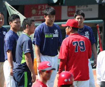 <広・ヤ>試合前、緒方監督(79)にオールスターのあいさつをする(左から)中村、(一人おいて)村上、山田 (撮影・奥 調) Photo by スポニチ 広島、上位打線大幅テコ入れ 1番に1414日ぶり菊池涼、2番に775日ぶり2度… ギャラリーで見る この記事のフォト 2019年07月04日の画像一覧 もっと見る 2019年07月04日の画像をもっと見る