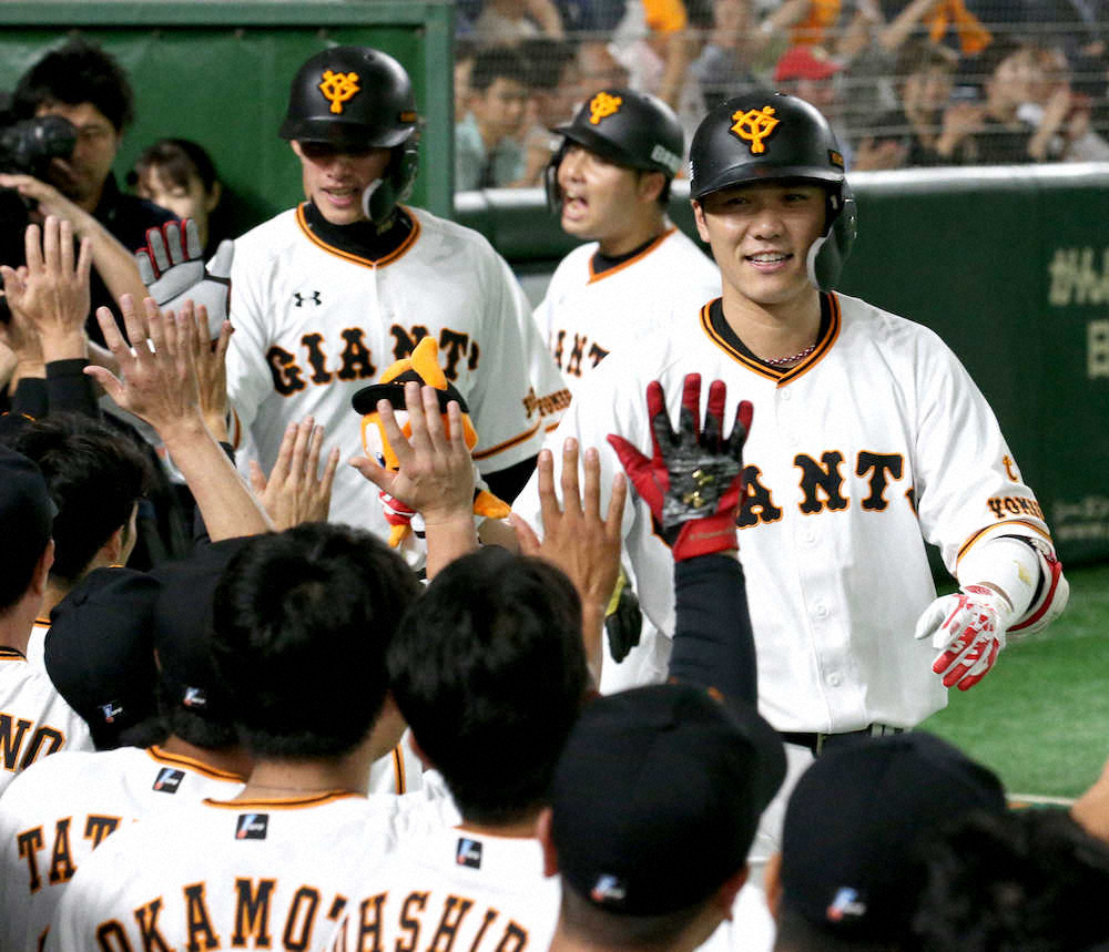 <巨・中>2回2死満塁、坂本勇は先制のグランドスラムを放ちナインの出迎えを受ける(撮影・森沢