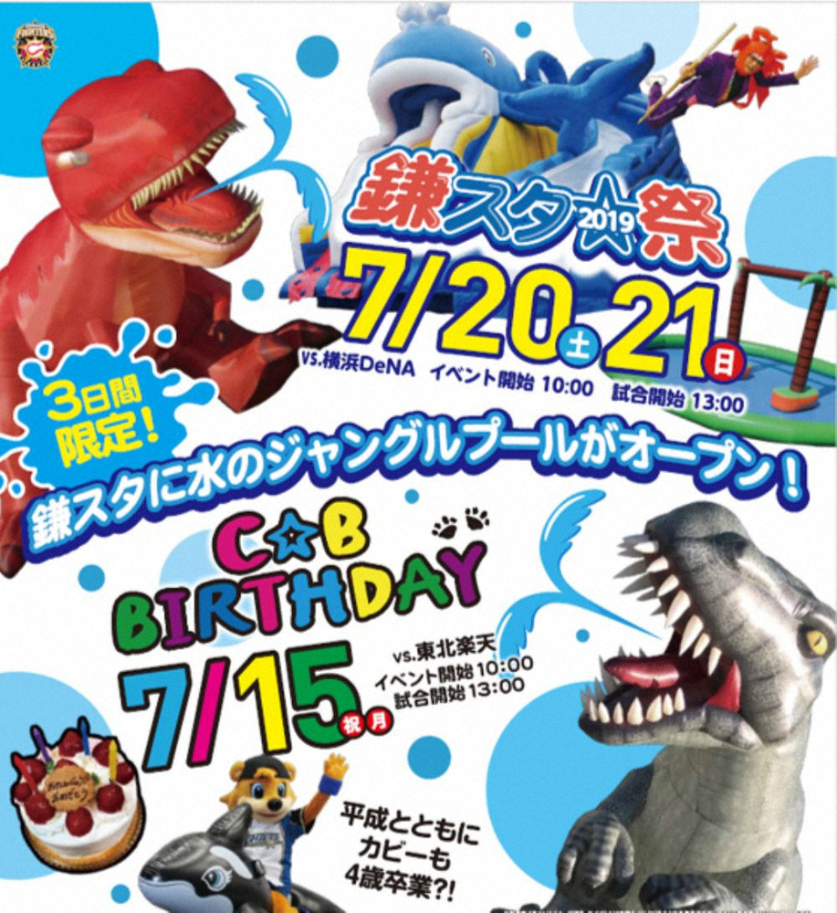 日本ハムは5日、2軍本拠地・鎌ケ谷スタジアムで行われる15日のイースタン・リーグ楽天戦で「C☆B(愛称:カビー)バースデー」、20、21日の同公式戦、DeNA戦で「鎌スタ☆祭2019」のイベントを行い、球場正面広場にはスライダー付きの巨大プール「鎌スタ☆水のジャングルプール」を開園すると発表した。