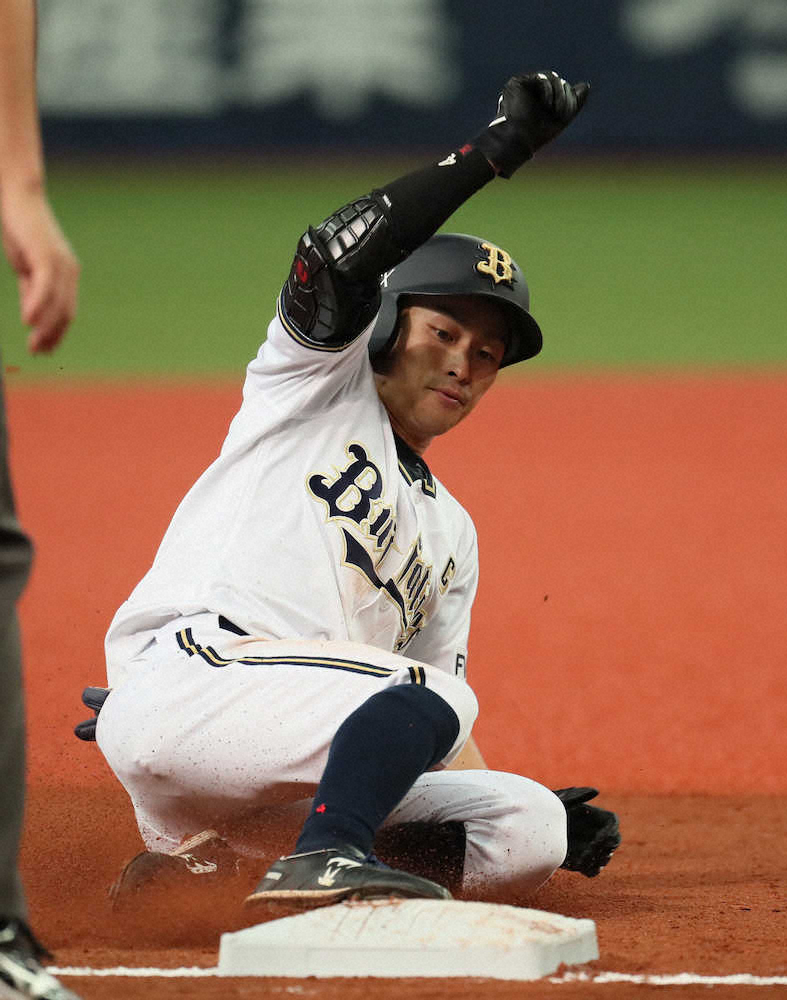 オリックス・福田は三塁ベース上でガッツポーズした。同点の5回1死二塁から小島のカットボールを捉えて決勝の右越え三塁打。「あの場面は、とにかくがむしゃらでした」。球種やコース、狙いを絞ったようで絞っていない。キャプテンの汚名返上にかける思いが決勝打になった。