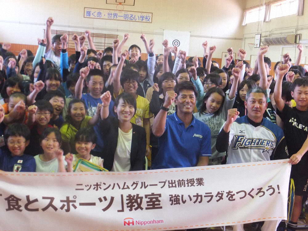 特別講師として日本ハム球団OBで侍ジャパン監督でもある稲葉篤紀SCO(スポーツ・コミュニティー・オフィサー)も参加。体育館では90人の児童と運動プログラムなどを行い、その後は児童とともに給食を食べた。最後は同グループ中央研究所の八巻法子管理栄養士による食育の授業にも参加。「子どもたちとふれあうと、心身ともに元気をもらえる。今後も体を動かすこと、食べることの大切さを伝えていきたい」と笑顔で語った。