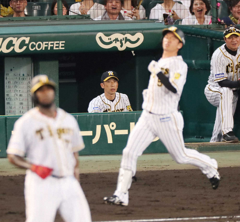 <神・巨>6回無死一塁、強硬策をとるも近本(右)が中飛に倒れて呆然の矢野監督。左はガルシア(撮影・北條 貴史)