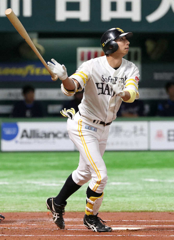 ソフトバンクの福田が1点を先制された直後の初回に8号逆転2ラン。甘く入った変化球を右中間テラス席へ運び、「本当につなぐことだけを考えていた」と振り返った。