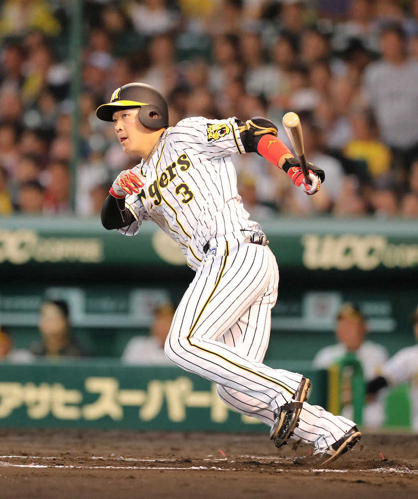 <神・巨13>6回1死、二塁打を放つ大山(撮影・後藤 正志)