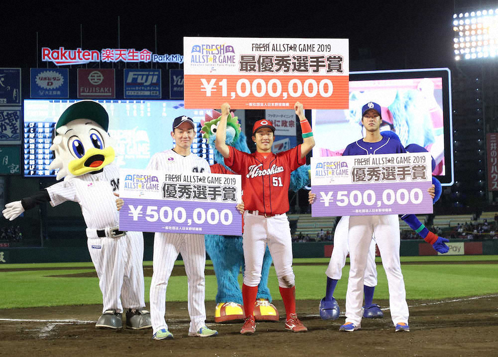通算成績はウエスタン選抜の29勝20敗6分け。最優秀選手賞(MVP)には先頭打者アーチを含む2安打を放った広島のドラフト1位ルーキー、小園海斗内野手(19)が選ばれ、賞金100万円を手にした。広島選手のMVP選出は2007年の中東以来12年ぶり。優秀選手には梅津(中日)と中村(ロッテ)が選ばれ、それぞれ賞金50万円が送られた。
