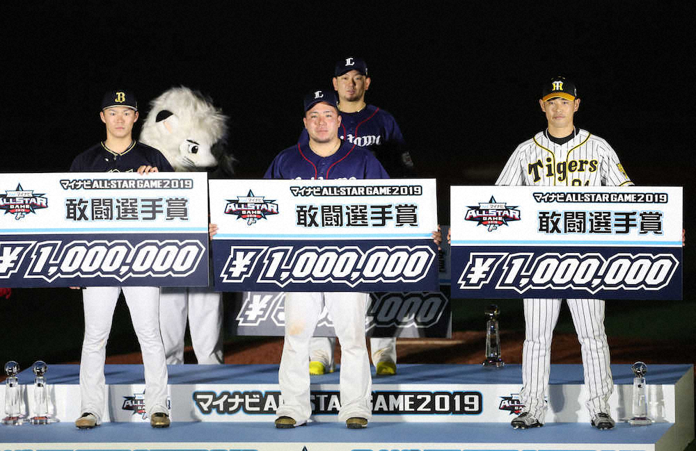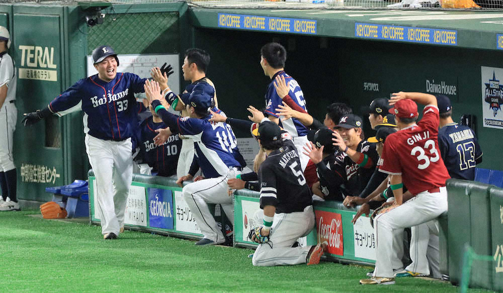 <全セ・全パ>9回2死一塁、代打・原口は2ランを放ちナインの出迎えを受ける(撮影・森沢裕) Photo by スポニチ 球宴も“実力のパ”が圧倒、セに5連勝 森2年連続MVP弾、浅村&山川連弾 セ… ギャラリーで見る この記事のフォト 2019年07月12日の画像一覧 もっと見る 2019年07月12日の画像をもっと見る