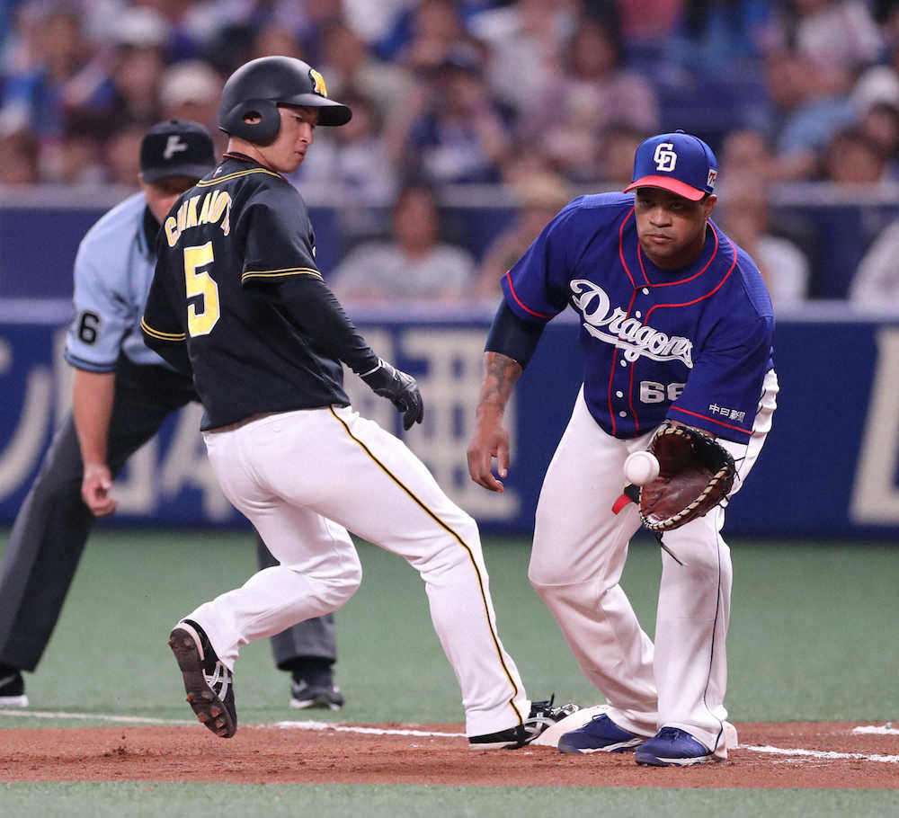 先頭・近本光司が中前打で出塁。俊足を気にした大野雄大は再三再四(実際には6球)、けん制球を放った。けん制はうまく、2度、投球でも帰塁していた。走れはしなかったが、打者への集中力をそいだことだろう。続く糸原健斗は二塁右に転がし、近本を進めた。こうして糸井嘉男の中前適時打につなげた。