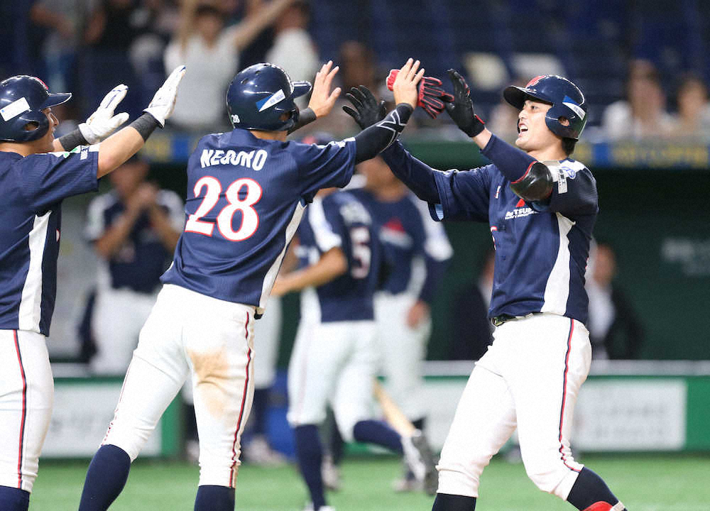 日本 4発9点圧勝で五分に 海野先制弾、郡司2打席連発、牧は特大ソロ