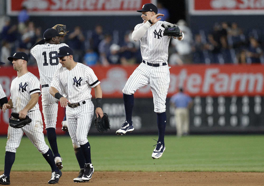 <ヤンキース・レイズ>ダブルヘッダーで2連勝し、喜ぶヤンキースナイン(AP)