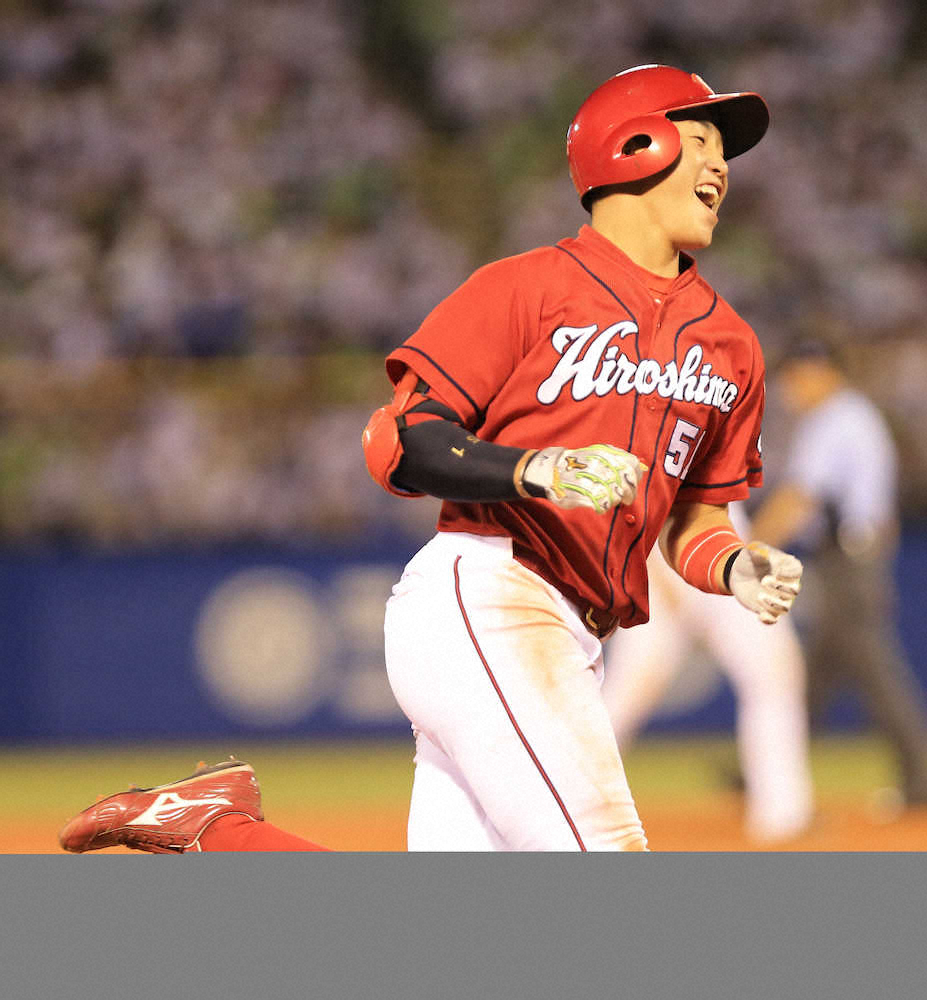 広島・小園海斗内野手(19)が26日のヤクルト戦で待望のプロ初アーチをかけた。3点優勢の3回に右中間席へ鮮やかな1号3ラン。サイクル安打の大記録こそ逃したものの、プロ初の4安打猛打賞に4打点の活躍で7連勝に貢献した。首位・巨人とのゲーム差は6に縮まった。