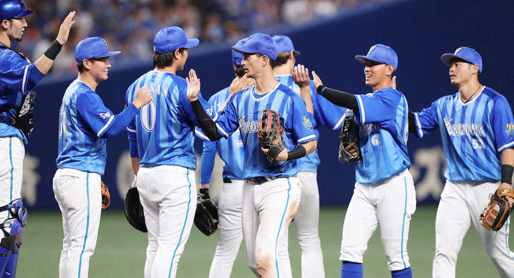 7連勝を飾り、マウンドでハイタッチするDeNAナイン(撮影・椎名 航)