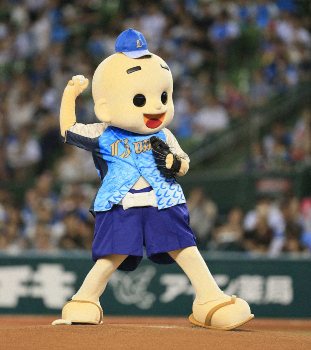 ◎西武戦で6度目の始球式に臨んだマルコメ君。試合前、過去の映像を見た辻監督は「おっ、左投げか。あれ、(次は)右…。なんだ、中の人が代わってるのか」。マルコメ君はブンブン首を振って否定していました。