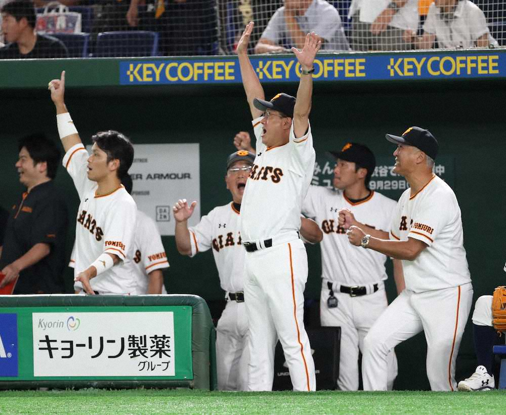 <巨・ヤ>10回1死満塁、亀井のサヨナラ犠飛にバンザイの原監督(左から2人目)ら巨人ベンチ(撮影・村上 大輔) Photo by スポニチ 巨人、亀井サヨナラ犠飛で首位死守!5発で最大7点差大逆転 4番・岡本起死… ギャラリーで見る この記事のフォト 2019年08月09日の画像一覧 もっと見る 2019年08月09日の画像をもっと見る
