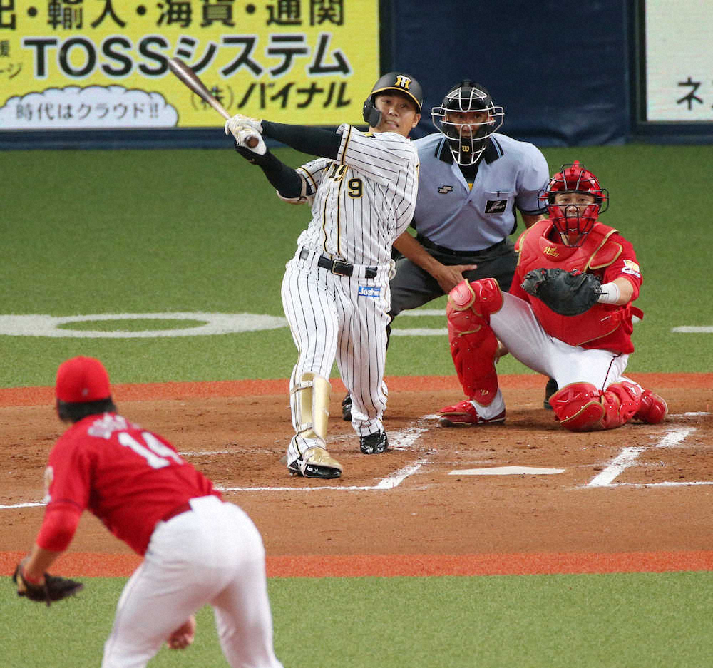 阪神が幸運な連打で先制に成功した。スコアレスで迎えた2回、先頭・マルテの左前打で無死一塁とすると、原口の放った一塁への弱い飛球は一塁手・バティスタの頭上を越えて一塁線に落ちる内野安打。さらに無死一、三塁から高山がスライダーを強振すると、打球は体の動きとは逆方向の左翼へ落ちる適時二塁打となって、前回2日の対戦で完封されている大瀬良から先制点を奪った。