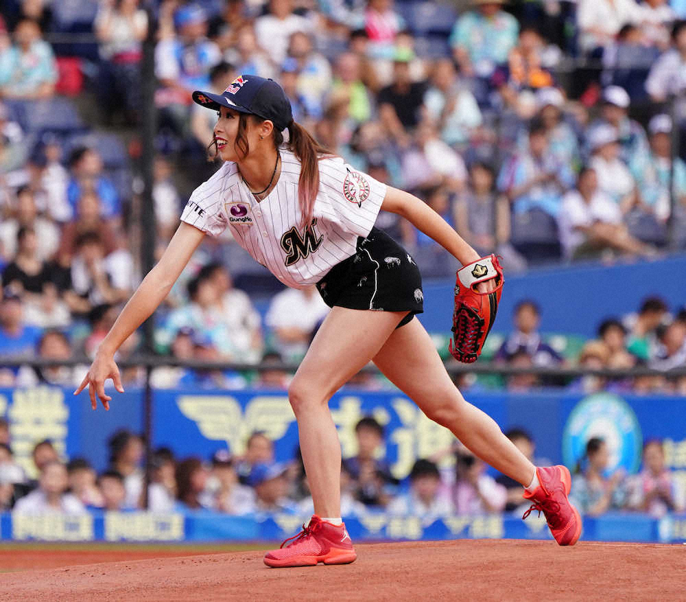 11日のロッテ―西武戦(ZOZOマリン)で平昌五輪日本代表の女子スノーボーダーでレッドブルアスリートの鬼塚雅(20)が、始球式に登場。打席のロッテ・平沢に対し、ノーバウンド投球を披露した。