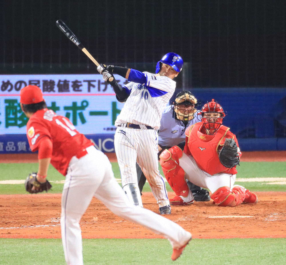 0―2の4回2死二、三塁。大瀬良の直球を捉えると、打球は中堅フェンスを直撃。戸柱は一気に三塁を陥れた。3試合ぶりのスタメン起用に応え、試合を振り出しに戻す一打に「チャンスの場面だったので積極的にいきました。ランナーを還すことができ良かったです」と気合を込めた。