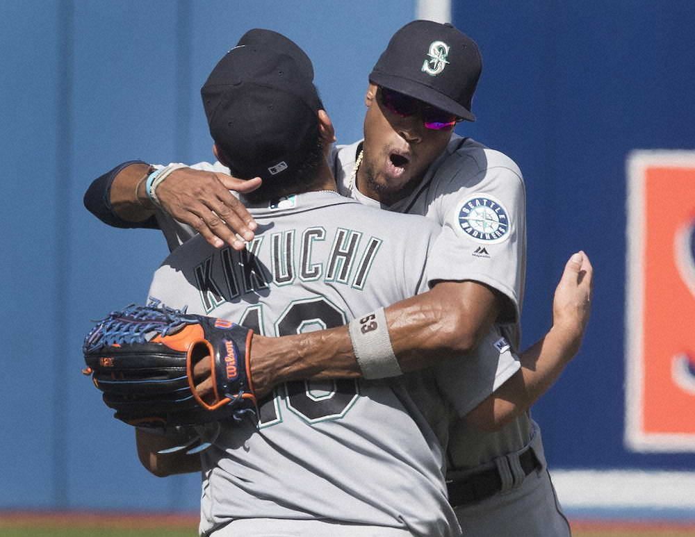 <ブルージェイズ・マリナーズ>メジャー初完封で5勝目を挙げた菊池(手前)はチームメートに祝福を受ける(AP)