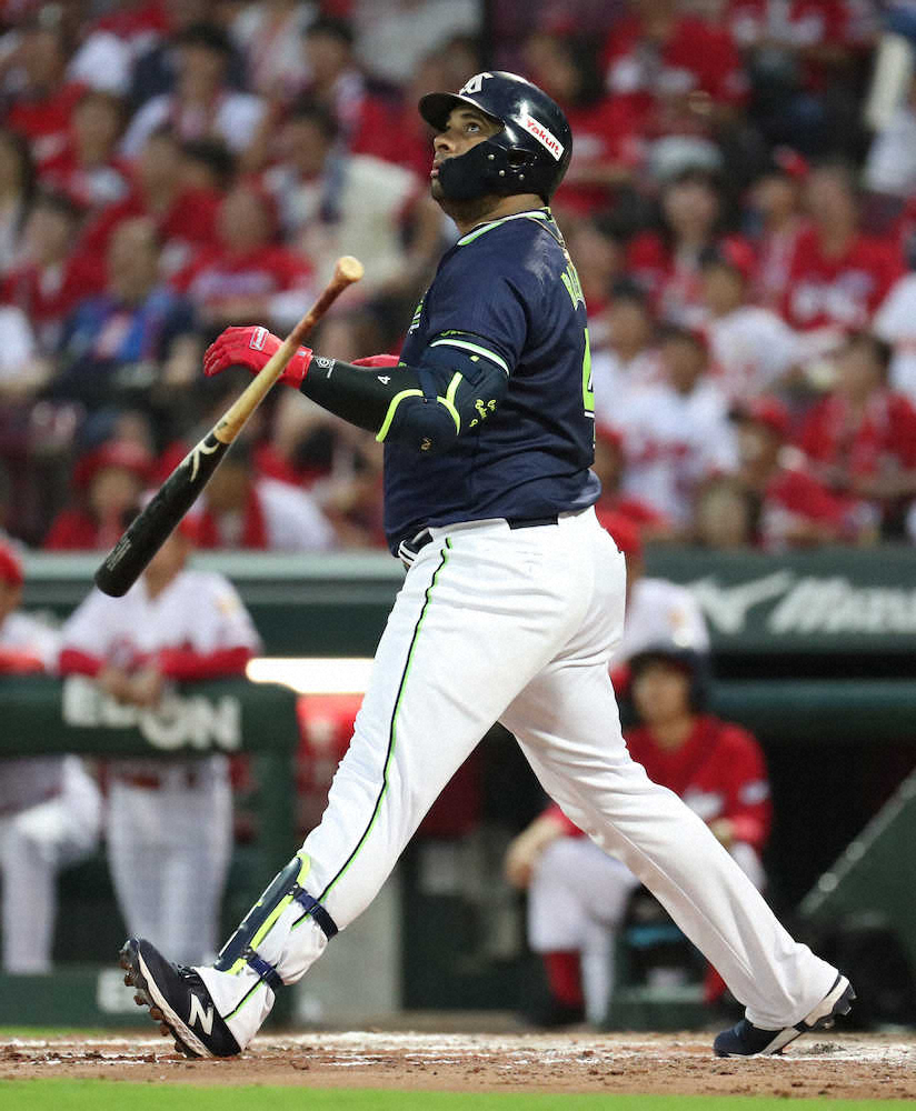 20日の広島戦(マツダ)に「4番・左翼」で先発出場。1点リードの3回2死一塁からジョンソンの内角高めのカットボールを左翼に運んだ。14日のDeNA戦以来、4試合ぶりの一発。「パーフェクトな当たりだったよ」と振り返った。