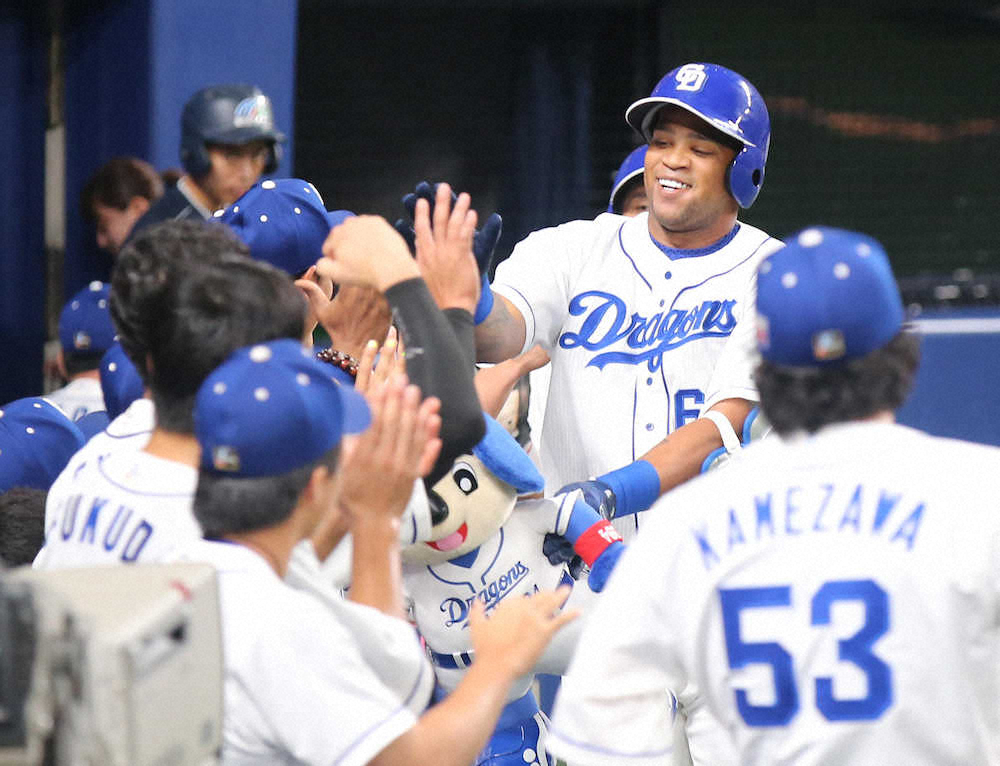 <中・巨>3回裏2死二塁、ビシエド(右)は左越え2ランホームランを放ち、ベンチのナインと笑顔でハイタッチ(撮影・椎名 航)