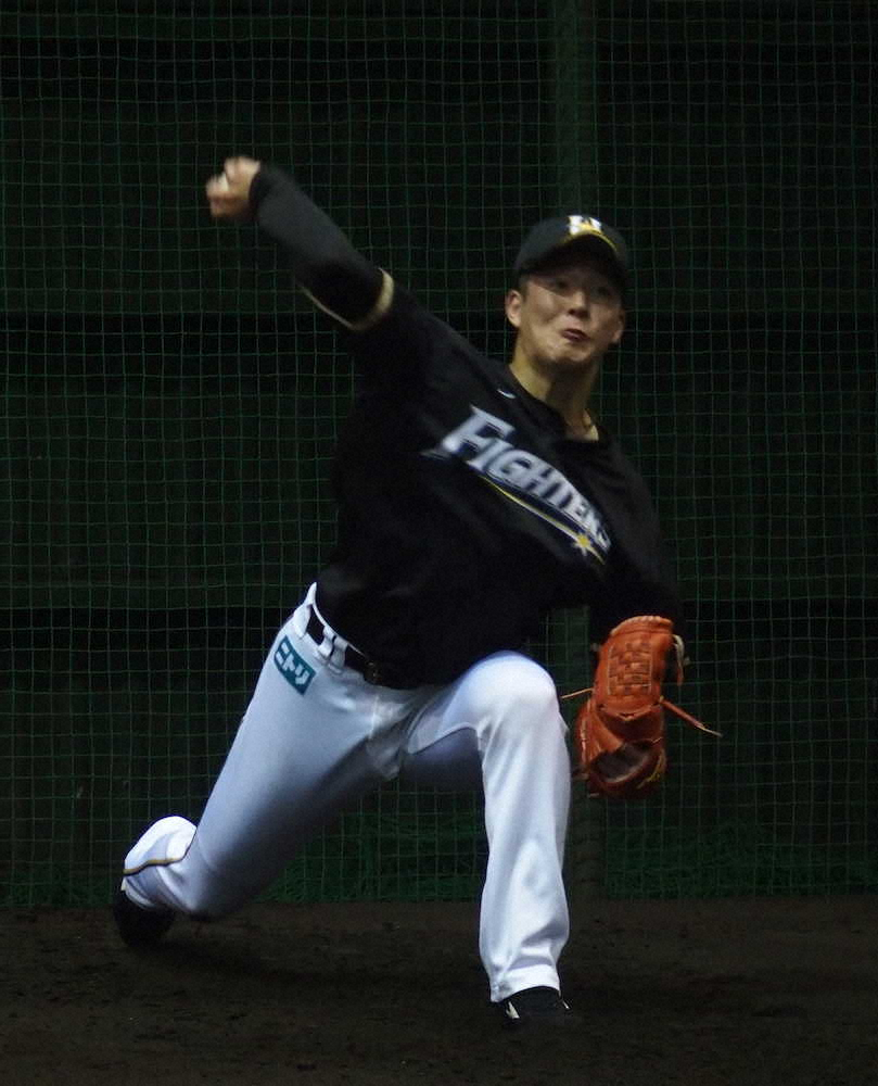 鎌ケ谷の室内練習場でブルペン投球を行う日本ハム・吉田輝