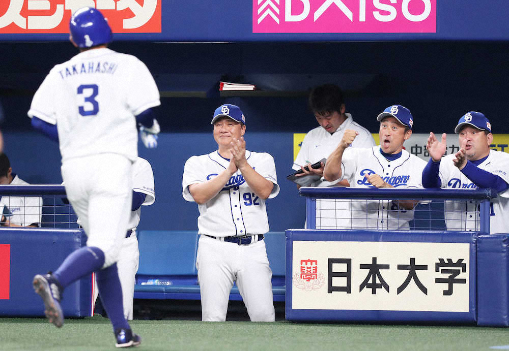 <中・広>6回裏2死二塁、阿部の左中間適時二塁打で生還した高橋(手前)を拍手で迎える与田監督(中)(撮影・椎名 航)