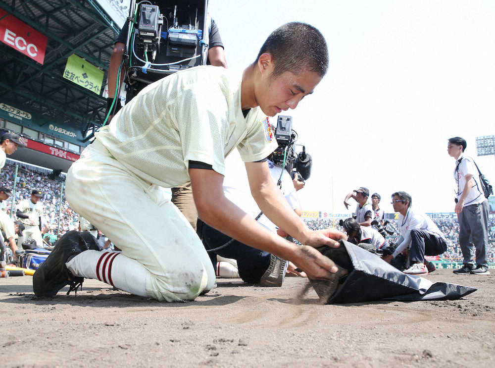 甲子園の土を集める作新学院・石井(撮影・大森 寛明)