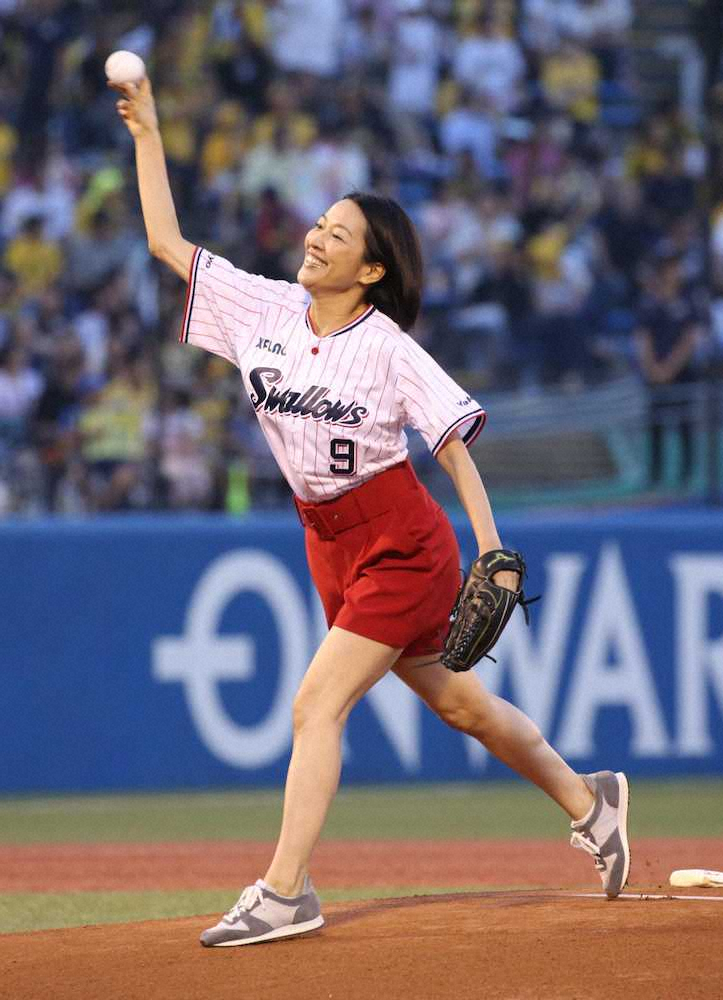 自身が出演するドラマ「特捜9」と9人でやる野球にちなんで、背番号「9」のヤクルトユニホーム姿で登場。投球は阪神・近本のバットが届かない一塁側に大きく逸れてしまったが、華やかな雰囲気で球場を盛り上げた。
