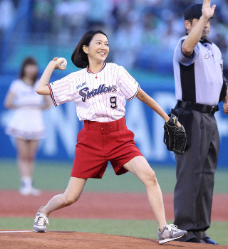 <ヤ・神>始球式を行った女優・羽田美智子(撮影・村上 大輔)