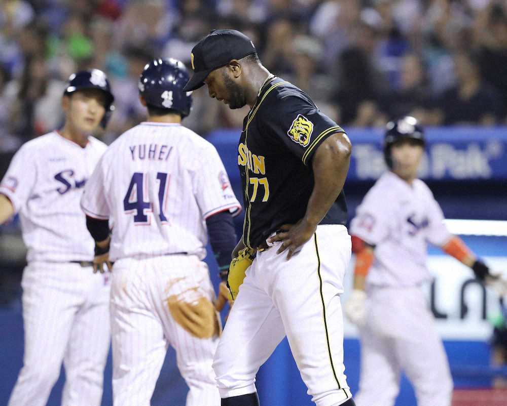 ベンチはなお2死一、二塁とされたところで継投を決断。無念の表情でマウンドを降りた背番号77は自身への怒りからか、ベンチにグラブを叩きつけて感情を露わにした。