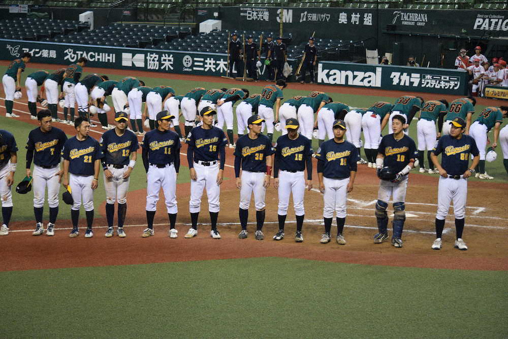 初戦敗退しスタンドにあいさつをする札幌ホーネッツナイン