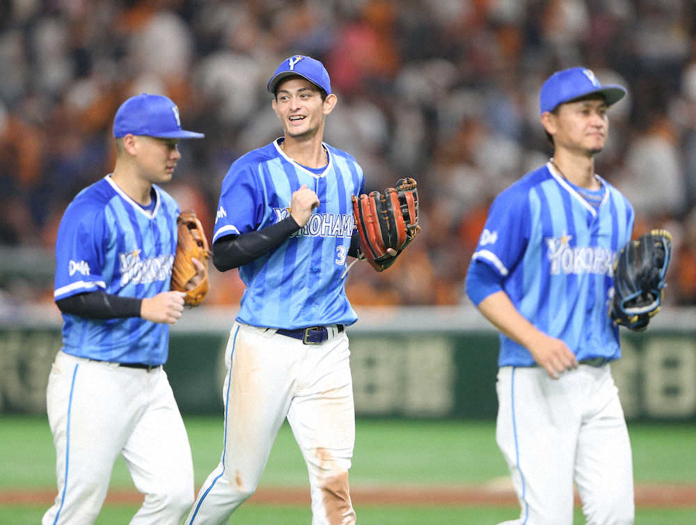 試合を終え笑顔でベンチに引き上げる乙坂(中央)らDeNAナイン(撮影・西川祐介)