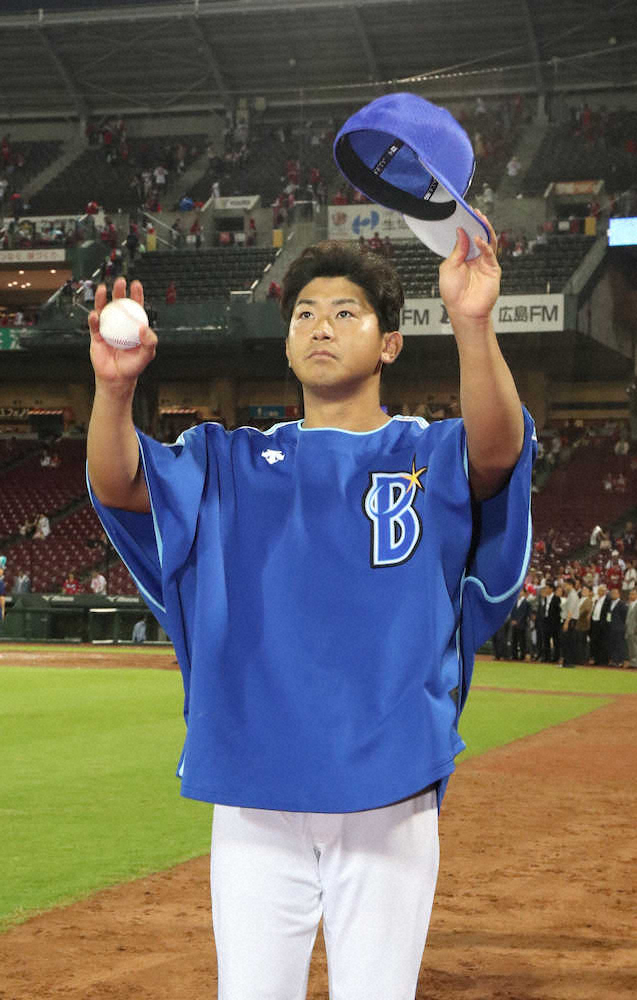 <広・D>ハーラートップの13勝目を挙げファンの声援に応える今永 (撮影・奥 調)