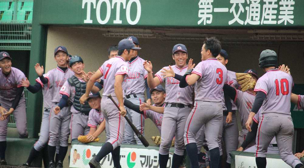 圧巻だった。九大打線が初回のスコアボードに「8」を刻んだ。先頭から3連打で無死満塁をつくると4番で主将の松田良が真ん中高めのチェンジアップを捉えて中越えに先制3点二塁打。「きょうが開幕戦のつもりだった。(初戦で)打てなかったことを忘れていきました」とベース上で、破顔一笑した。