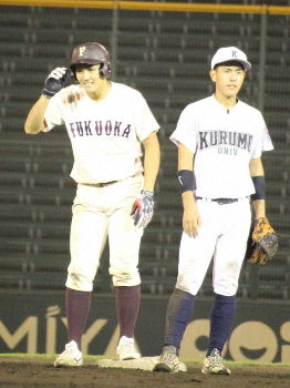<福岡大>3時間45分の熱戦を制して初勝利だ。延長12回に相手野選で勝ち越し。続く途中出場の田中歩が2死一、三塁から初球の直球を叩き、右越えに適時二塁打。貴重な追加点に「オープン戦では緊張しがちだったので、初球からいこうと思った」と胸を張った。2季連続制覇を狙う中で8月31日の開幕戦は3―4で惜敗。試合前から「ここから全勝しよう」と声をかけ合い士気を高めた。